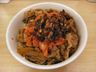 新メニューのきんぴらキムチ牛カルビ丼\480を食べました。牛カルビ丼の上に以前食べた、きんぴらキムカル丼に載っていたきんぴらキムチが載ったものですね。きんぴらはゴボウとニンジン。そしてレンコンでできています。ゴボウのシャキシャキ感と甘めのタレで焼かれた牛肉の組み合わせはなかなかおもしろいものでした。 (12.6) ※肉が固いなどと、苦情が多かったらしく、登場してからすぐにメニューから消えてしまいました。 |