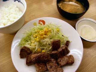 新メニューの角切りステーキ定食\690を食べてみました。今までの松屋メニューの中で一番高い定食かな?ちょっと時間がかかって運ばれた定食は、珍しく肉と生野菜が同じ皿に盛られています。メインの牛肉は1cm弱の厚さ。角切りって謳っていますが、普通のステーキ肉を切ったという感じです。脂身は少なく、赤身がほとんどですね。肉は塩コショウで味付けされているので、そのままでもいいのですが、好みで焼肉用のポン酢タレやバーべーキュー味タレをかけて食べてもいいです。大根おろしもついて来たので、大根おろしに醤油をかけて、大根を絡めて食べてみました。 肉はそこそこの厚さがあって、牛肉を食べているって感じを充分に味わうことができます。当然のことながら輸入牛肉でしょうが、ちょっと硬めなのはしかたないですね。米沢牛などの和牛ブランド牛と比べちゃいけないですね。 (10.12) |