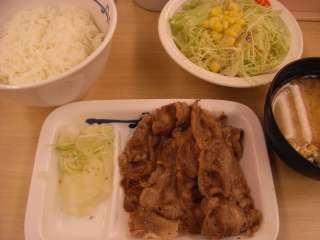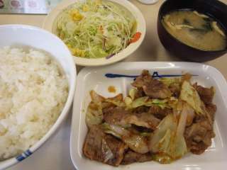 今日は牛焼肉定食\630を食べました。牛の焼肉と大根おろし、生野菜がついています。肉には胡椒だけ振られていて、ポン酢味タレ、バーべーキュー味タレ、カルビタレなどを選んで味付けすることができます。牛肉は牛丼より厚めでボリュームがあります。ちょっと脂身が多い部分です。ちょっと固めだったのが残念です。 (09.6) |