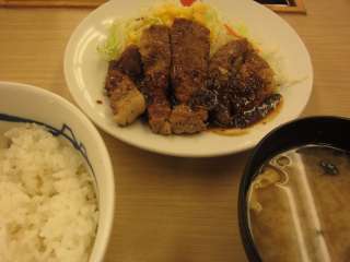 今日は新メニューの豚テキ定食\680を注文しました。それにみそ汁を豚汁に変更して貰って+\180です。松屋としては最高料金なのでちょっとビビってしまいました。どんなもの食べさせてくれるのかと期待感大です。出てきた定食はけっこう厚めの豚肉をソテーしたものとサラダ、ご飯、みそ汁がついています。 豚テキは厚めの肉で食べ応えしっかりとあります。ちょっと酸味のあるにんにく醤油味のタレがかかっています。そんなにニンニクの味や香りは強くないので、仕事の途中で食べても大丈夫かな?食べ応えのある豚テキでした。 (09.4) |