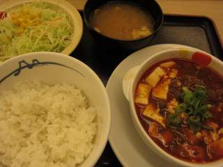 最近、マーボ豆腐丼が復活したと思ったら、いつの間にかマーボ豆腐定食\490に取って代わられたようで、廃番のようです。で、今回はマーボ豆腐定食を食べてみました。皿に盛られた麻婆豆腐と生野菜、ご飯、味噌汁がセットになっています。マーボ豆腐丼が\390だったから、ちょっと割高なような気がしますね。さて、メインの麻婆豆腐はピリッと山椒が利いた辛さ。ラー油も利いていますが、山椒の辛みが程々で、辛みが苦手な私にもおいしく食べることができました。 (12.3) |