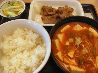 松屋の前を通ると新メニューの看板が… で、ついつい引き寄せられてしまいました。新メニューは冬になると登場する、豆腐キムチチゲです。ご飯とのセットの豆腐キムチチゲセット\490とカルビ焼も組み合わさったチゲ・カルビ焼きセット\680があります。今回はチゲ・カルビ焼きセットを食べてみました。 ちょっと辛めのキムチチゲには豆腐だけでなく牛肉も入っています。寒い冬に温まる辛味の利いたスープ?は美味しかったです。そしてカルビ焼は定食のものより肉が薄めで量も少なめなのかな?でも、キムチチゲと共に食べると、けっこうなボリュームでお腹いっぱいになりました。 (10.12) |