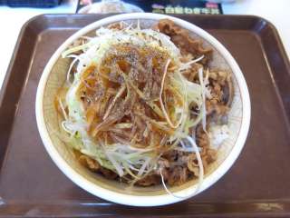 新メニューの白髪ねぎ牛丼\380を食べてみました。たっぷりの白髪ねぎの上にタレと黒胡椒がかかっています。タレにはラー油も入っているようで甘みの中に辛さがあります。そこに胡椒の辛さも加わっています。白髪ねぎのシャキシャキ感が味わえていいんですが、黒胡椒の辛さが余分かな〜 ラー油の辛さだけで十分という気もしました。 (11.4) |