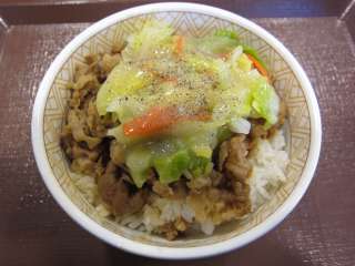 またまた期間限定の春キャベツ牛丼\380なるものが出たというので、食べてみました。茹でた春キャベツに塩ダレで味付けをして、その上に黒胡椒をまぶしたものが牛丼の上に載っています。運ばれた時から黒胡椒の香りが漂い、いい感じです。まずは春キャベツに箸をつけると、甘みの中にいい塩梅の味付けがされています。シャキシャキ感もいいですね。今までになかった牛丼ですね。 (12.3) |