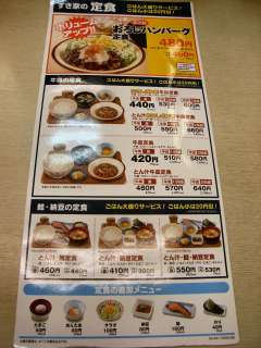 期間限定とのことで朝食セット\190!とあったので食べてみました。普段は\280です。ごく普通のどんぶり飯と生玉子、味付き海苔、お新香、味噌汁でこのお値段ですから激安ですね。普通どんぶり飯だけで\150〜\200はとられますからね。仕事の日にはちょっと早起きしてこの朝食でしっかりとお腹を満たせば、仕事もはかどる?日本の定番朝食ですな。 (12.1) |