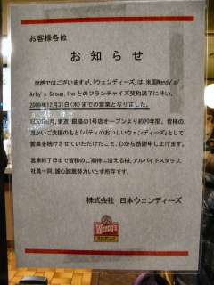 御用納めの日、たまたま新聞を呼んでいたら、ハンバーガーチェーンのウェンディーズが年内で営業を終了するとの記事が出ていました。元々ウェンディーズはアメリカのハンバーガーチェーンだそうですが、今月末で現在ライセンスを結んでいる会社がハンバーガーチェーンから撤退するにもかかわらず、あとを引き次ぐ会社がいないとのことで、日本からの撤退とのことです。元々パン系はほぼ食べない私は当然のことながらハンバーガー類も年に1回食べるかどうかといった感じです。今回、湯友との忘年会の後にそばにあったウェンディーズに寄ってみることにしました。 |