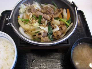 吉野家の前を通ったら、他の店にはない牛バラ野菜焼き定食\490なるものがあったので、ついつい寄ってしまいました。牛すき御膳定食で揃えた鍋セットの元を取る?ために店舗限定で新メニューをいくつか作っているようですが、なかなかデビューできないようですね。 しばらくして運ばれた定食は、牛バラ肉と玉ネギ、ニンジン、もやしなどを一緒に炒めたものでした。スタミナ焼きというのかな?やや甘めといった感じのタレで、アツアツをいただくことができるので美味しいのですがあ、やはり冷房が入っているとはいえ熱いです!一般化は難しいかな?ごちそうさまでした。 (14.7) |