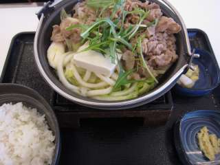 今日は牛すき鍋定食\530を食べました。この定食は以前からあるんですが、最近は扱いをやめる店もあるみたいでどの店でも食べられるものではないみたいです。もしかしたら廃番に近いのかも? すき焼き風の鍋で、鍋皿の上には牛肉、白菜、水菜、玉ネギ、麩、うどんなどが載っています。他に生玉子、お新香、ご飯、みそ汁が付いています。味はちょっと甘めで牛丼とは一味違います。他にいろいろな具があるからか、牛肉はちょっと少なめかな。牛丼とは違った味を楽しみたい時にいいかな。 (09.5) |