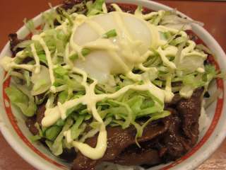 てりマヨ焼き牛丼\390をいただきました。しばらくして運ばれた牛丼は、焼き肉の上にレタスを載せ、マヨネーズをかけたものでした。まずは焼き肉に箸を付けると普通のタレではなく、やや甘めのもの。これも焼き肉に合っているかな?マヨを混ぜると一気に味が濃くなります。マヨラーというわけではないけど、焼き牛丼ともなかなか合う組み合わせですね。 (13.4) |