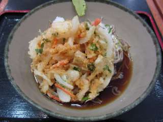 出来上がるまでちょっと待ち時間がありました。そばの上にはかき揚げとワカメなどが載っています。そばは細めで更科っぽいものです。美味しかったのはやはり、かき揚げ。店で揚げているんでしょうか?玉ネギや海老などがサクッと揚がっていて、よくある立ち食いそばのかき揚げとは一線を画しています。なかなかいいそばでした。 (12.6) |