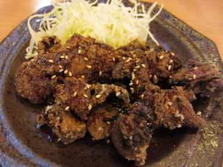 続いてこちらも新メニューの鶏の甘辛揚げ\302です。もうちょっと身がある唐揚げかと思っていましたが、身は薄くかなりパリパリに揚げてあるので、堅めの唐揚げというか鶏皮揚げって感じです。ちょっと歯が痛んでいるので食べにくかったですね。 |