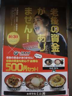 今日の富士そばは、某映画とのタイアップメニュー、老後の資金も安心!?お得な500円セットをいただきました。全く、ストレートなネーミングですね。蕎麦・うどんとミニ丼を選べるので、もりそばにミニ旨辛豚丼の組み合わせでね。 |