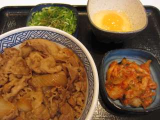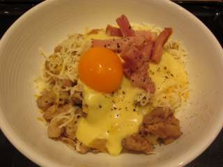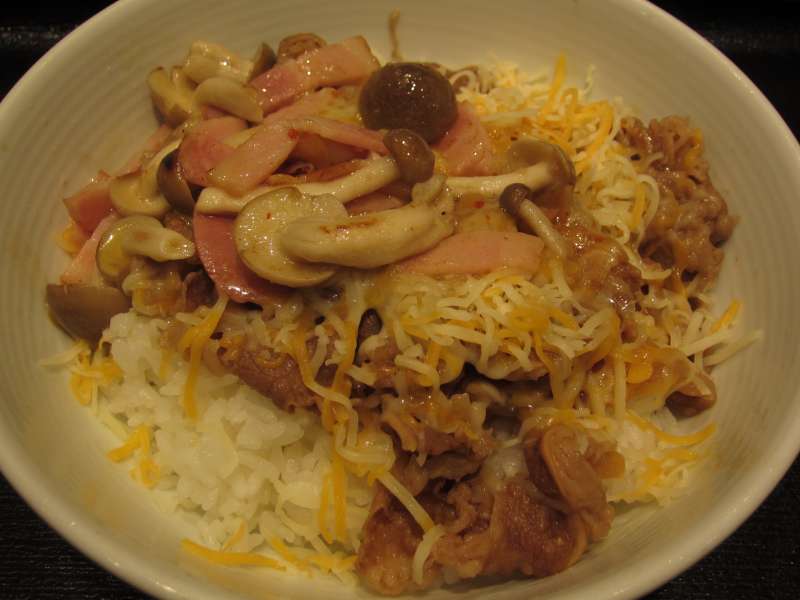 牛丼にとろけるチーズとベーコンを載せ、生玉子を添えたものです。生玉子は黄身だけを載せてやりました。 |