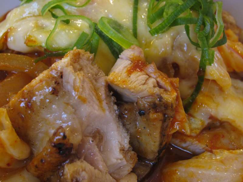コチジャンなのでかなりの辛さかと思っていたのですが、玉ネギのせいか、それともチーズのせいでしょうか?辛さの中に甘みを感じます。鶏モモ肉はかなりのボリュームがあり、お腹も満たされました。でも、もう少し安ければ満点なんですがね!ごちそうさまでした。 (18.1) |