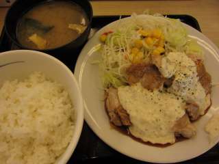 久々の松屋。今日は期間限定の復活メニューという、チキン定食\680をね。何でも40年ぶりの復活だとか!さっそくいただいてみました。 |