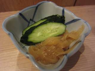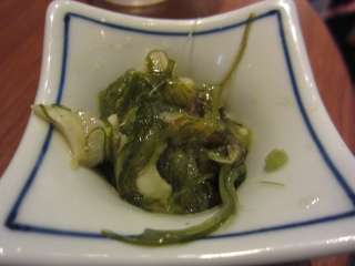 こちらも新メニューのつぶ貝ワサビ¥180。ワサビ風味のつぶ貝かと思っていたんだけど、チョッと違っていましたね。つぶ貝を海草と和えたものだったのね。 |
