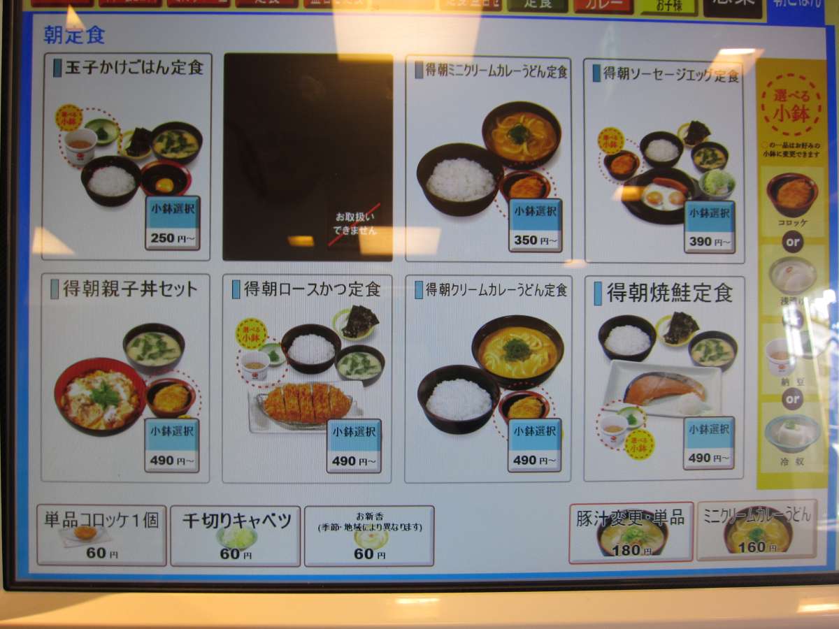 久々の松のや。いつもの特朝ソーセージエッグ定食\390にみそ汁を豚汁\100に変更してね。 それにしても、新しい券売機の使いにくさ!これと同じような券売機、最近見かけるけど、タブ式は手順が多すぎて困る! まず、店内食か持ち帰りを選びます。 |