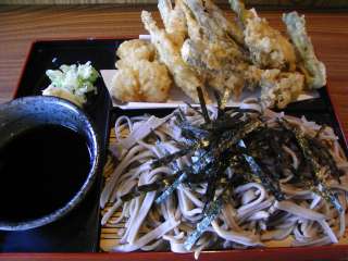 しばらくして運ばれてきた天ざるはけっこうなボリュームがあります。蕎麦は「田舎そば」の名のごとく、色は濃く、幅は不揃い。一口食べると、つなぎが入っていないか、ほとんど入っていないと言うことなんでしょうか、ボソボソッとした歯応えで、プチプチと切れやすい蕎麦です。でも、蕎麦らしい蕎麦で美味しい蕎麦です。天ぷらは海老、ホタテ、ししゃも、ナス、ピーマンが2つずつ盛られています。ボリュームがあって満腹ですが、1つずつでいいのでもうちょっとお安い方がいいかな? (10.8) |