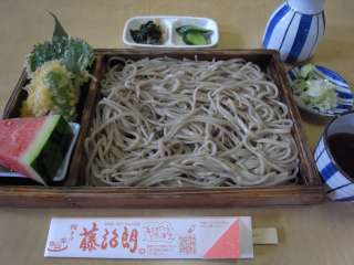 しばらくして出てきた板そばは、そばだけでなくししとう、大葉、カボチャの野菜天とデザートのスイカも載っています。そばはかなり太めで白みが強いですが、そばの実の黒さも見えます。固めで、しっかりとした食べ応えがあります。つゆはちょっと甘めでした。 (09.8) |