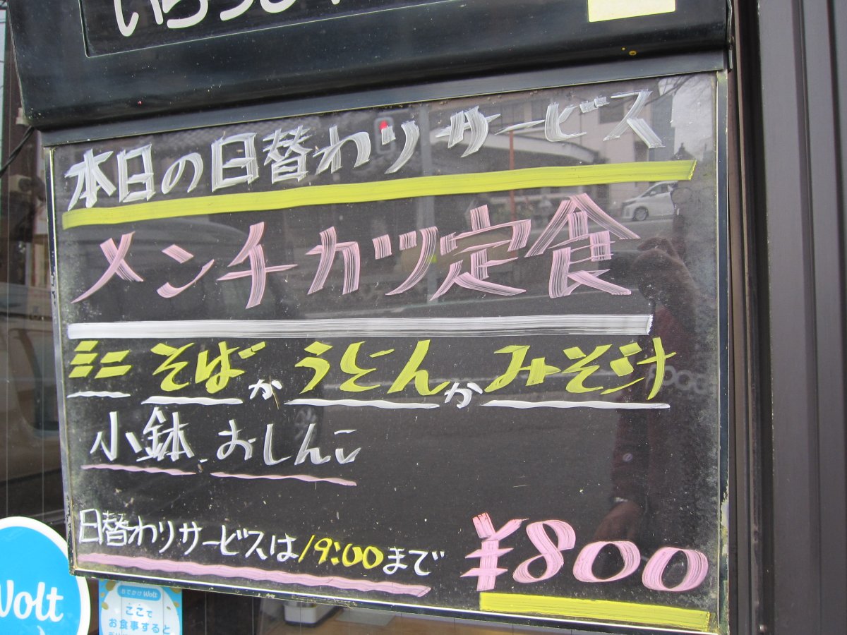 メニューはそば・うどんから始まってラーメン系、丼物、定食とたくさんあって何を食べようかと迷ってしまいます。日替わりサービスもありますね。で、選んだのは、一番人気というかつ丼\800をね。 |