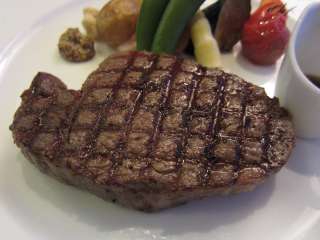 で、注文はサーロインにするかフィレにするかだけ。本当はサーロインの旨みのあるアブラをいただきたいのですが、さすがに上質とはいえ脂身が多いサーロインは応えるので特選フィレステーキセット\9400(抜き)をレアでお願いしました。 |