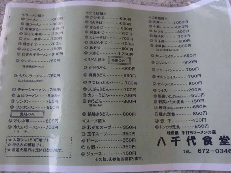 メニューを見ると、麺類から丼物、定食まで揃っていて、まさしく正統派の駅前食堂です。何を食べようと見ていると、天ぷら中華\700なるものがあります。まあ、ラーメンに天ぷらを載せたものですが、天ぷら蕎麦があるのに天ぷらを載せたラーメンがあっても不思議ではありません。ということで、どんなものかと思いながら天ぷら中華をいただくことにしました。 |