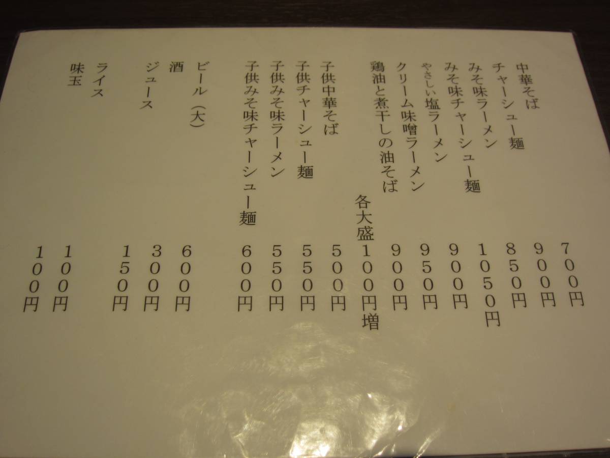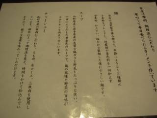 久しぶりの再訪です。 メニューは基本、以前と変わっていないようです。今回はやさしい塩ラーメン(味玉付き)\950にしてみました。 |