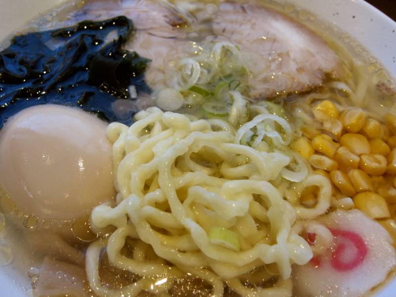 運ばれたラーメンは、チャーシューに味玉、わかめ、メンマ、なるとなどが載っています。 スープを啜ると、塩らしい、優しい味わいが口の中に広がります。旨い!麺はちぢれのある太麺。しっかりとした歯応えですね。やっぱり満足感高いですね。ごちそうさまでした。 (25.9) |