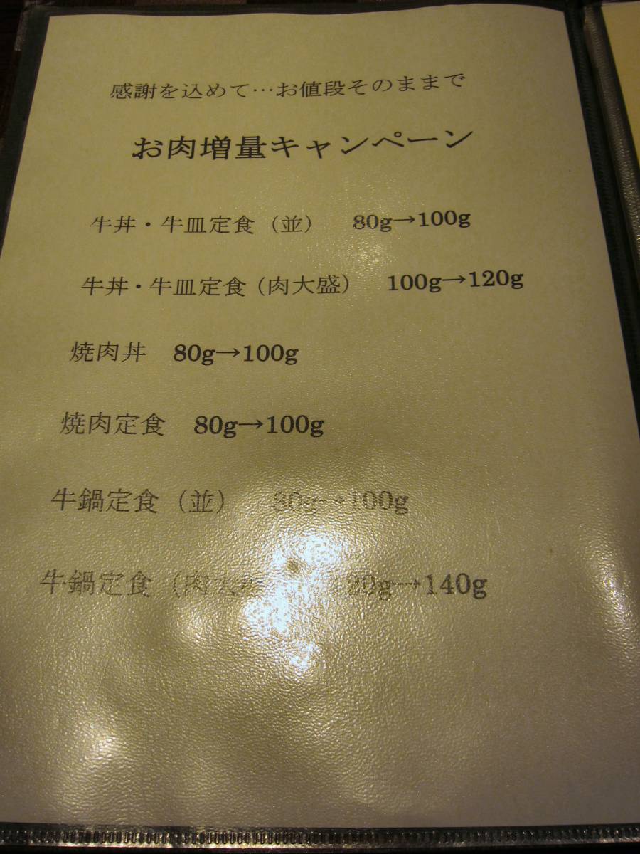 メニューを見ると、牛丼などお手軽に食べられるものも並んでいます。とはいえ、チェーン店ほどの安さじゃないけどね(^-^ゞ 今回は米沢牛・牛鍋定食(肉大盛)\3190をね。ラッキーなことにお肉増量キャンペーンで、ちょっとお得! |