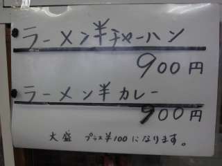 メニューを見ると、街食堂らしく、いろんなものがあって迷っちゃいます。で、今日はラーメン+半カレーセット\900にしました。 |