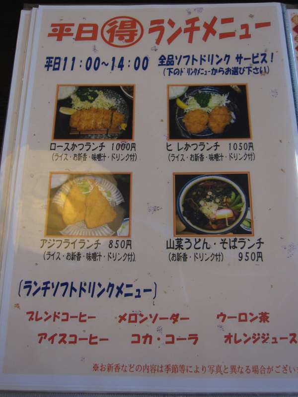 メニューはとんかつメインで、ロース、ヒレの他にソースカツ丼、味噌かつなどもあります。店の外にはうどん、そば。そして天ぷらとありますが、ランチ営業終了間近だったからか天ぷらはないとのこと。そしてうどんやそばはそんなにメニューは豊富ではありませんでした。で、今回は味噌ロースかつ定食ロース(小120g)\1200を注文しました。 |