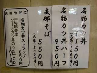 メニューはと見ると、名物カツ丼\1150とハーフサイズ\950。そし支那そば\600しかありません。「食堂」と名は付いていますが、以前の名残なんでしょうか。それにしても、メニューに「名物」と付けてしまうところがすごいですね。でも、有名店にも関わらず店の方は低姿勢で気持ちよく食事をすることができました。 |
