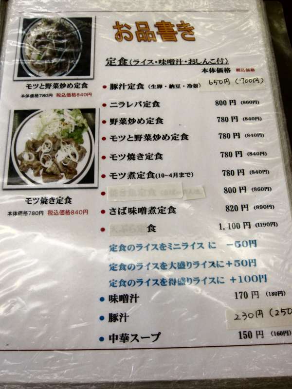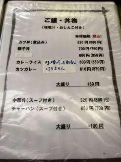 席に案内され、メニューを見ると定食や麺類、ご飯ものなど多くの品が並んでいます。何を食べようかと迷ってしましますが、今回はこちらの店の売りである、250gもの肉を使うという大名とんかつ定食\1620をいただくことにしました。 |