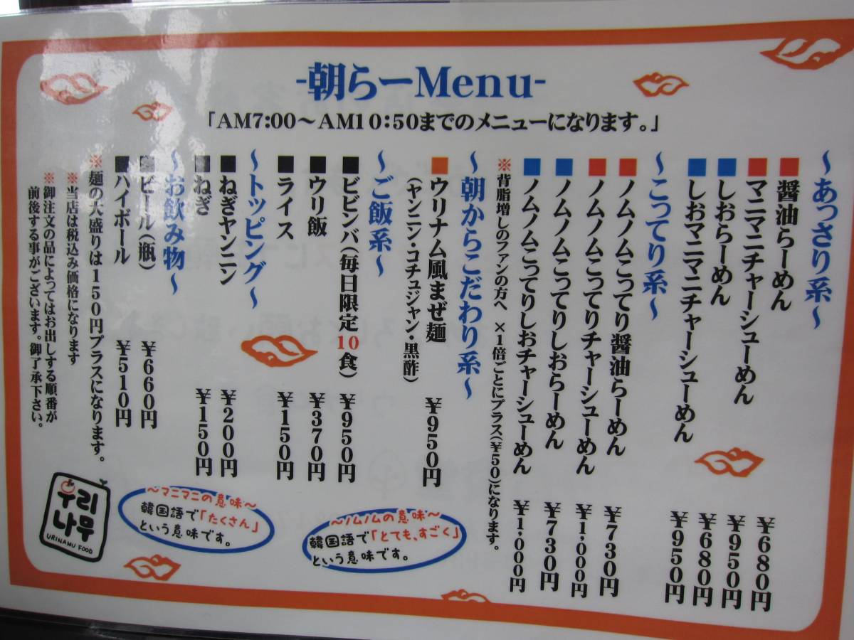 メニューは朝ラー専用のものなのかな?昼とかは別メニューがあるような感じですね。 さて、メニューを見ると醤油と塩がメインで、あっさりと背脂を入れたこってり系があるとのこと。今回は背脂入りのこってり系のノムノムこってりしおらーめん\710をいただくことにしました。ちなみに「ノムノム」とは韓国語で「とても」の意味だそうです。 |