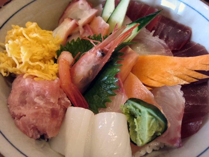 海鮮丼にはまぐろ、ぶり、いか、ネギトロ、たこ、錦糸玉子などたくさんの魚介が載っています。このお値段ならかなりお得感ありますね。ご飯は酢飯ではなく、普通の白めし。ここいら辺は好みが分かれるかな?でも、ちょい堅めというか、ご飯が引っ付いた感じでね。宿のご飯が新米で美味しすぎたからなのかな? |