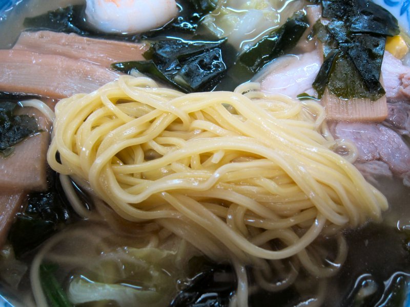 運ばれたタンメンは、思ってたより野菜多めです。キャベツ、もやし、にら、玉ねぎ、きくらげに豚肉などかな。 塩味とはいえ、普通の塩ラーメンでは味わえない旨さ。野菜の旨みが溶け込んでいるんでしょうね。シャキシャキの野菜自体も旨いしね。麺は細麺でもちっとした感じだけど、やはり、少し物足りないかな? |