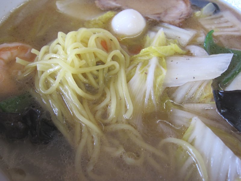 久しぶりの千成亭は五目そば\990でね。 運ばれた五目そばは、白菜メインの野菜ににんじん、ネギ、筍、きくらげ、ピーマンなどにかまぼこ、海老、うずらの玉子、豚肉などが入った豪華版。麺はストレートの細麺。 やや濃いめのスープはもちろん塩味。具の旨みが溶け込んだスープは旨いんだけどやや胡椒強めで辛め。そこだけが残念だったな。ごちそうさまでした。 (25.11) |