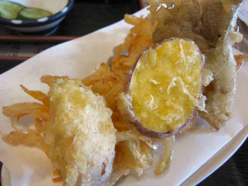 メニューにはかき揚げと季節の野菜の天ぷらが添えられるとあったけど、かき揚げが2つとさつまいもや舞茸に珍しいりんごの天ぷら。季節の野菜がもっとあるのかと思っていたんだけど、少なくて残念だったかな。でも、蕎麦自体は美味しかったよ。大盛りにすればよかったくらい。ごちそうさまでした。 (25.10)  |