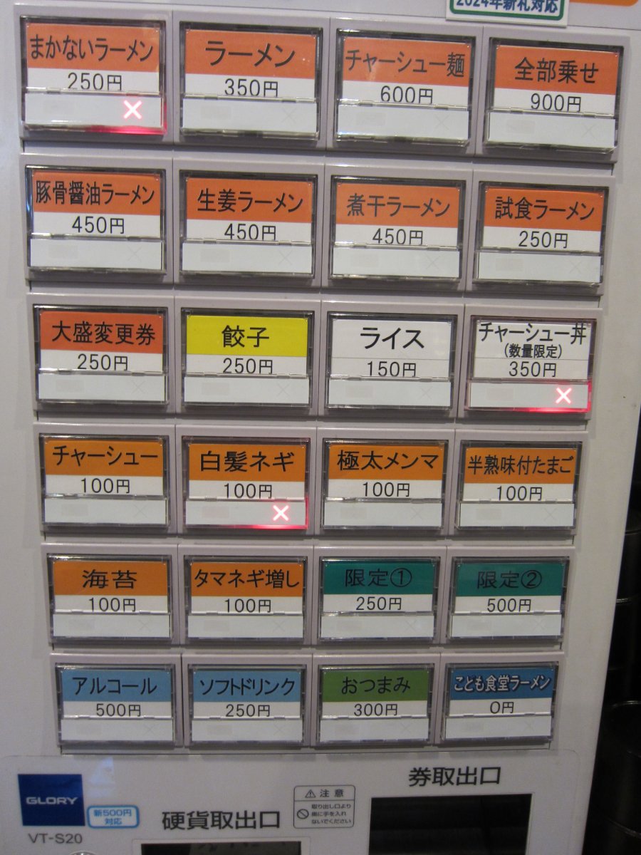 順番が来て店内にある券売機で食券を購入します。お目当ての「まかないラーメン」は売り切れなので、同じく¥250の限定のえびみそラーメンと¥250の餃子をいただくことにしました。ラーメンと技を食べてもワンコインって、信じられないですよね。 |
