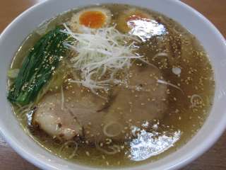 そう待たずに運ばれたラーメンは、大きなチャーシューが1枚と脂が多めのスープにゴマが浮いた、印象的なもの。スープを啜ると、魚介系かな?やや甘みを感じる、やさしいもの。麺はかなり細めのストレート。しかも、かなり柔らか目なので、もう少し堅めか太麺の方がよかったかな。チャーシューは厚みもあり食べ応え十分です。 |