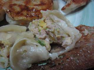 中を見ると、柿餃子は柿の実が入ってる感じ。そのまま食べると、柿の風味はあまり感じられませんが、ほんのりと甘みを感じます。 |