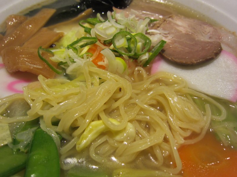 具の下には落とした半熟玉子が隠れていました。 ス−プは塩。やはり、「五目」は、いろいろな具の旨さを味わうに塩がいいよね。 麺は細めのストレート。モチっとしたもの。麺はそうボリュ−ムないけど、やはり具だくさんだからかなりお腹いっぱいになりました。ごちそうさまでした。 (26.3) |