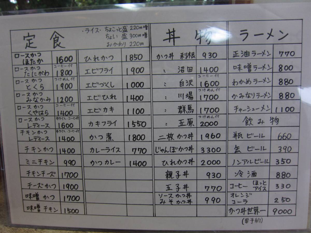メニューを見ると、とんかつだけでなく、ラーメンもありますね。 ユニークなのは、とんかつやかつ丼の名に地名がつけられていること。う〜ん、どんな違いなのかな?写真もないしね。でも、壁に飾られている色紙を見ると、デカ盛りの店みたいだから、とんかつのボリュームの違いなのかな?でも、そんなに腹減ってなかったから、今回はかつ丼の利根\920をね。様子見よ。 |