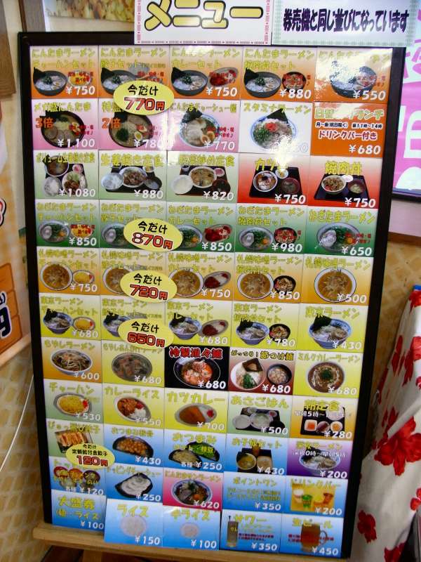 「にんにくたまごラーメン」は醤油、味噌、塩と3つの味から選べるようです。他にスタミナラーメン、東京ラーメン、札幌味噌ラーメン、ミルクカレーラーメンなどの麺とチャーハン、カレーライス、焼肉丼などご飯ものも充実しています。今回は醤油のにんにくたまごラーメン\550とサービス価格となっていた餃子\120を注文しました。 |