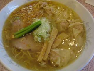 注文は券売機で食券買う方式。基本、地鶏を使ったスープが売りのようで、塩と醤油の二本立て。あとはワンタンとチャーシューでバリエーションだしてる感じ。今回は塩ネギワンタンメン\980をね。 |