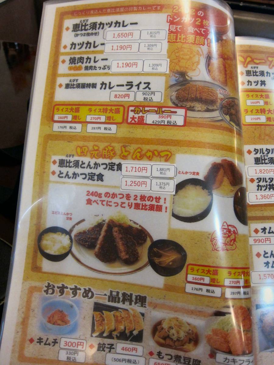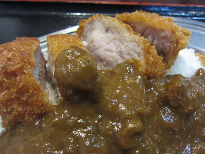 売りのとんかつなんだけど、今回はカツカレー\1309をいただくことにしました。 かつメニューは普通のヤツと「恵比須」と付くものがあるんだけど、普通のものでもかつは240gもあるそうですが、「恵比須」と付くものはこのかつが2枚盛りだそうです。なのでかつだけで500g近くあるから、胃袋に自信がある人だけにした方がいいかもね。 |