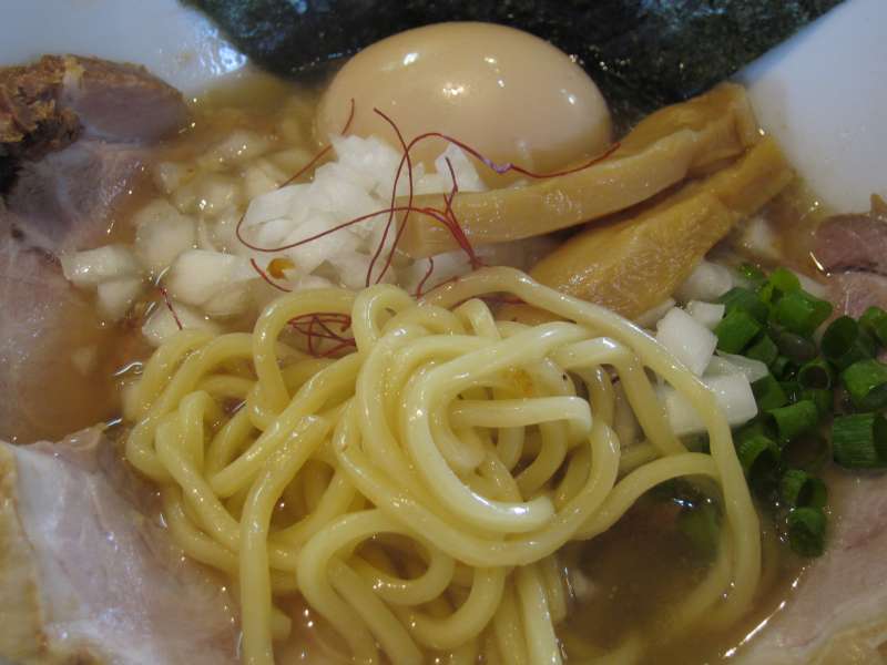 すぐに運ばれたラーメンは、海老は載っておらず、大きめのチャーシューが3枚にメンマ、味玉、海苔に万能ネギ、タマネギのみじん切りが載っています。