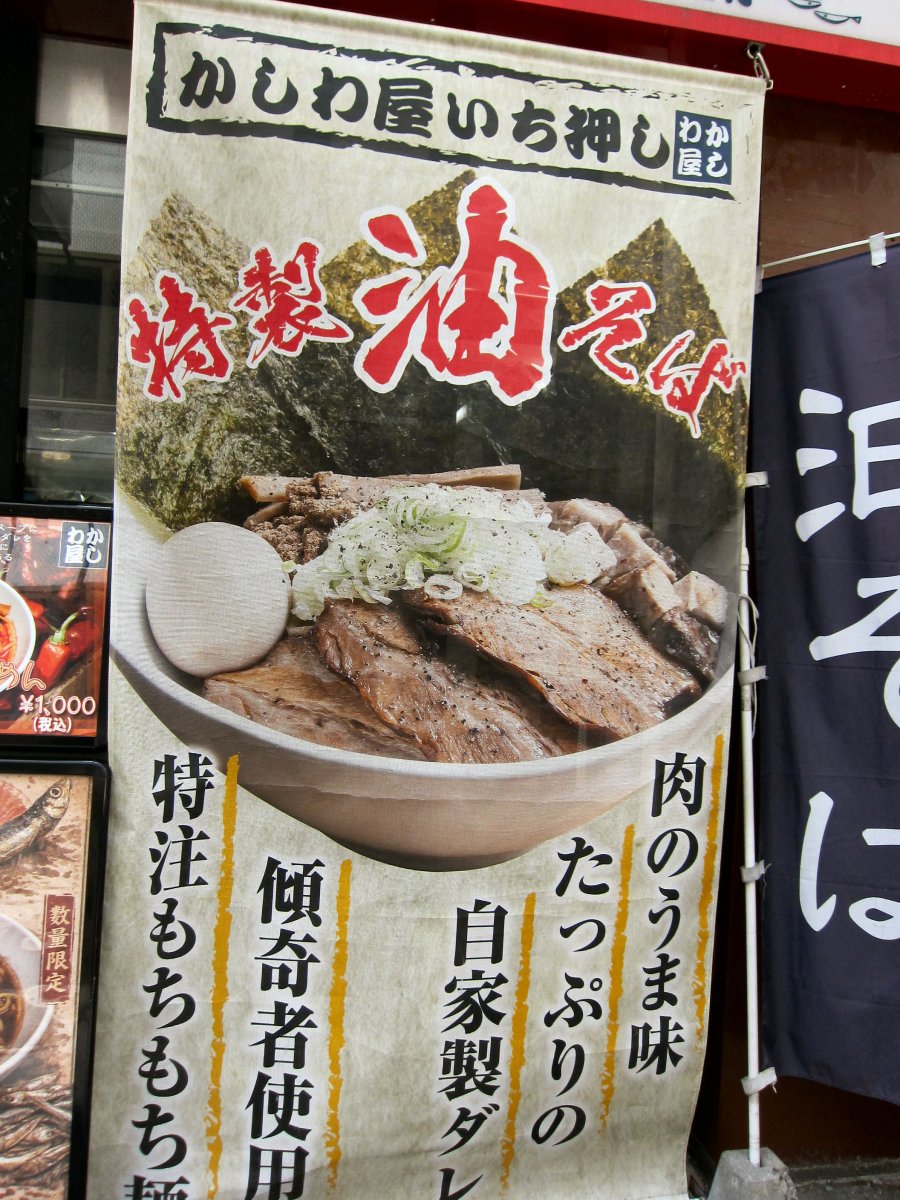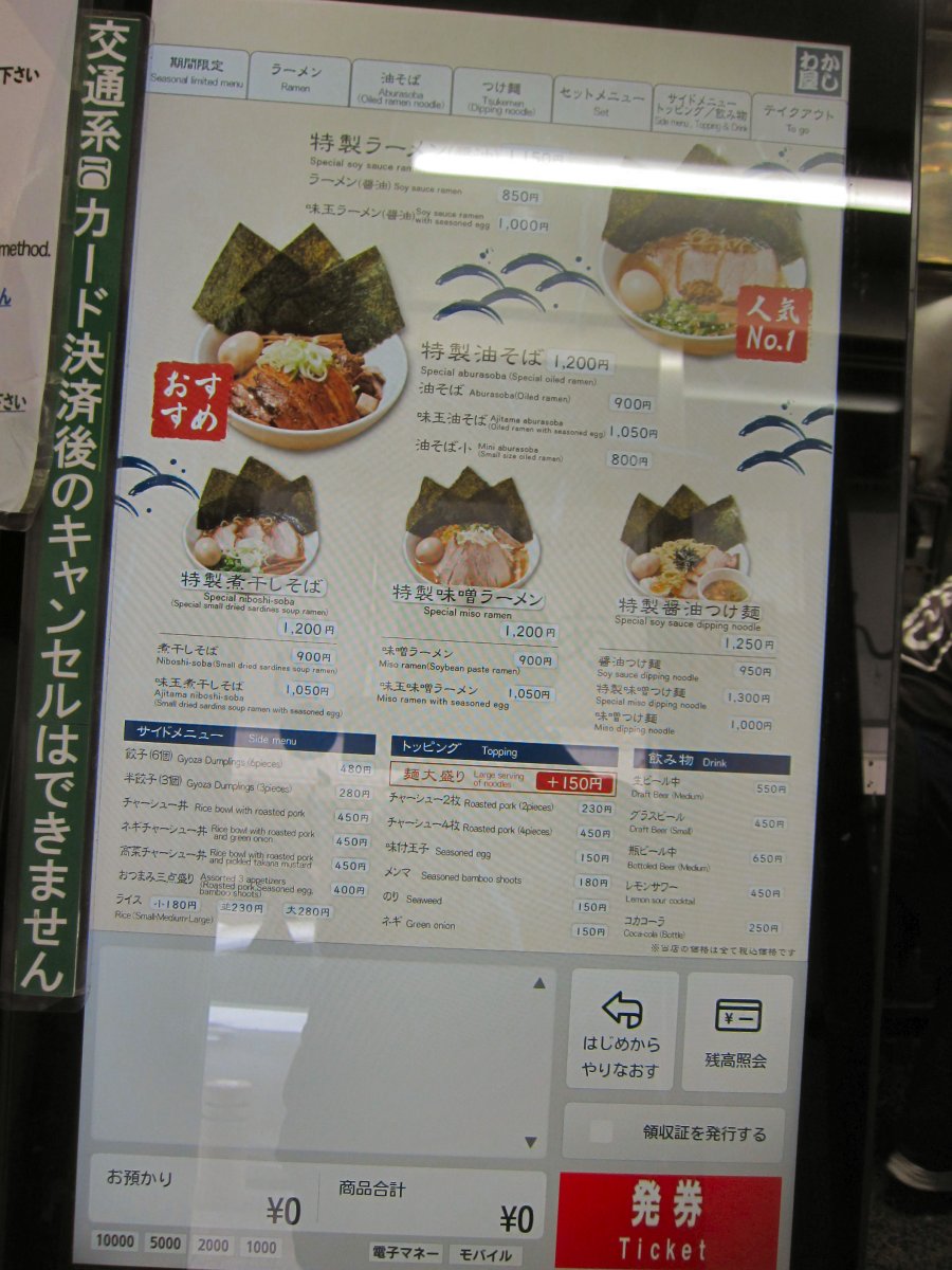注文は入口の券売機で食券買う方式。でも、苦手な多機能式なんだよね。最後ということもあり、全部載せの特製油そば\1200のボタンをポツリとね。 |