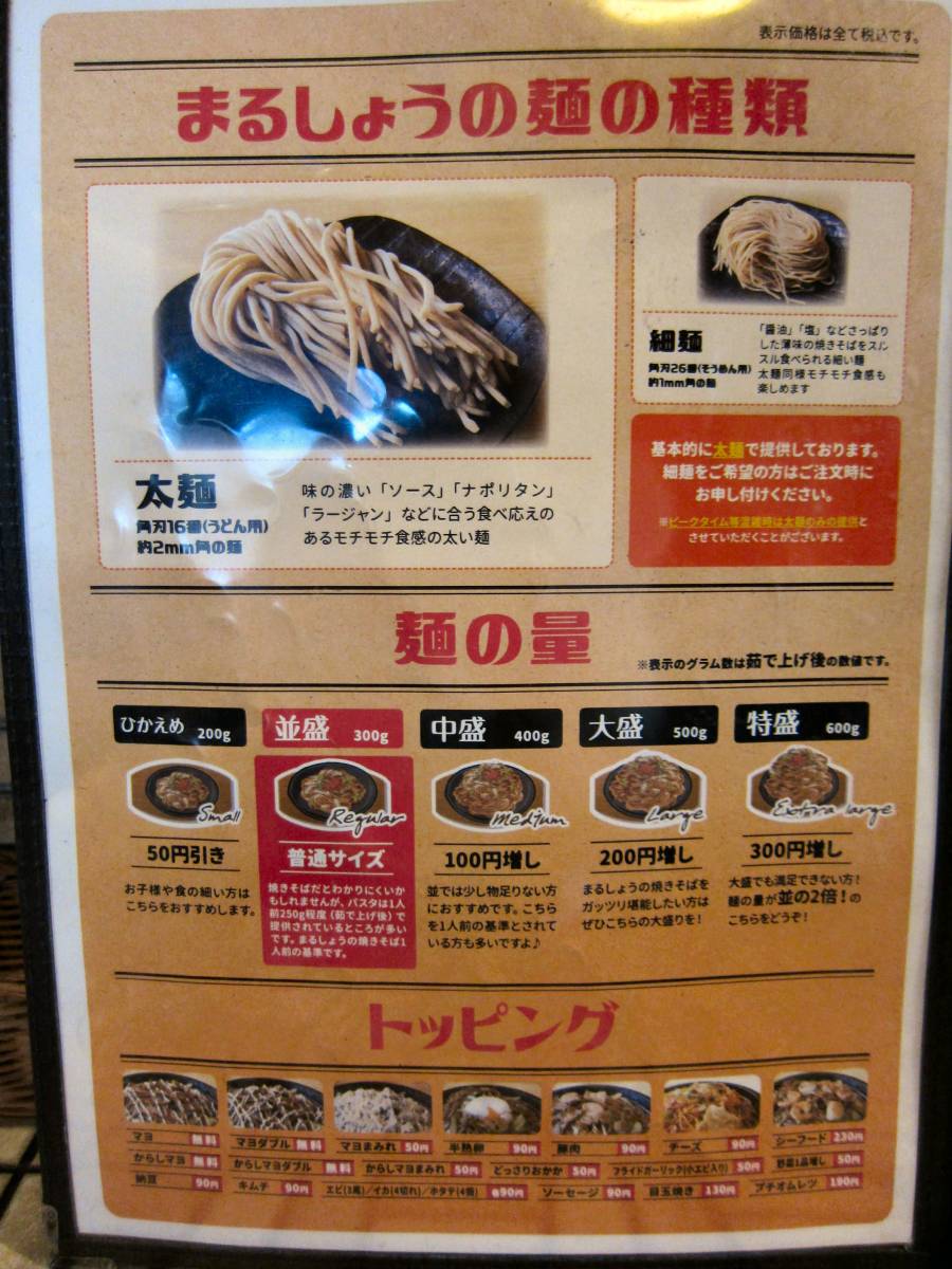 メニューを見ると、焼きそばは、メイン?のソース焼きそばだけでなく、塩焼きそば、醤油焼きそばなど、色々なバリエーション出してます。そして、トッピングも色々とね。やはり、ひとつだけだと飽きられますからね。 |