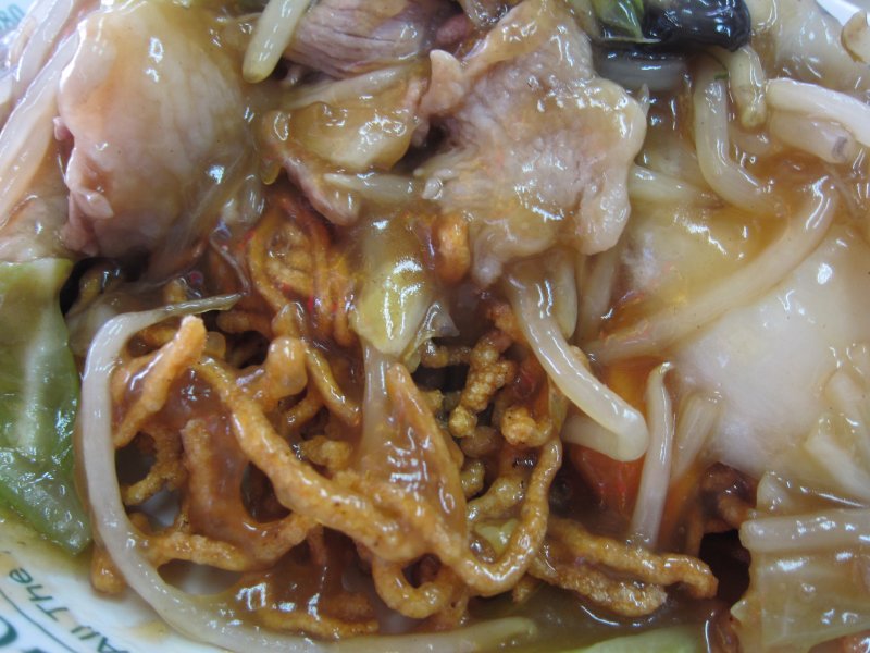 運ばれたカタヤキソバは、もやし、白菜、キャベツやにんじん、ネギ、玉ねぎ、きくらげに豚肉などがたっぷりと入った餡がかけられています。醤油系の味付けです。 麺はやや太めのもの。かなり揚げていて堅め。餡がかかってもフニャとあまりならないタイプ。歯応えありすぎでした。 ちょい時間かかったけど、おいしく完食しました。ごちそうさまでした。 (25.11) |